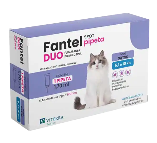 - 1 pipeta de 1,70 ml (Fluralaner 408 mg + Ivermectina 5,1 mg) para gatos de 5,1–10 kg de peso.